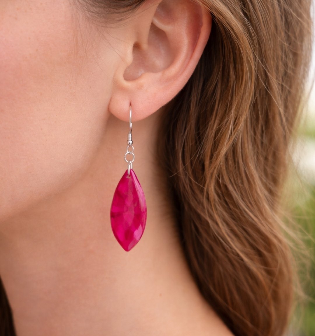 The rich pink tone catches the sun and almost glows, creating a soft shimmer that moves as you move. They are lightweight, easy to wear, and just the right size to make a statement without feeling heavy.