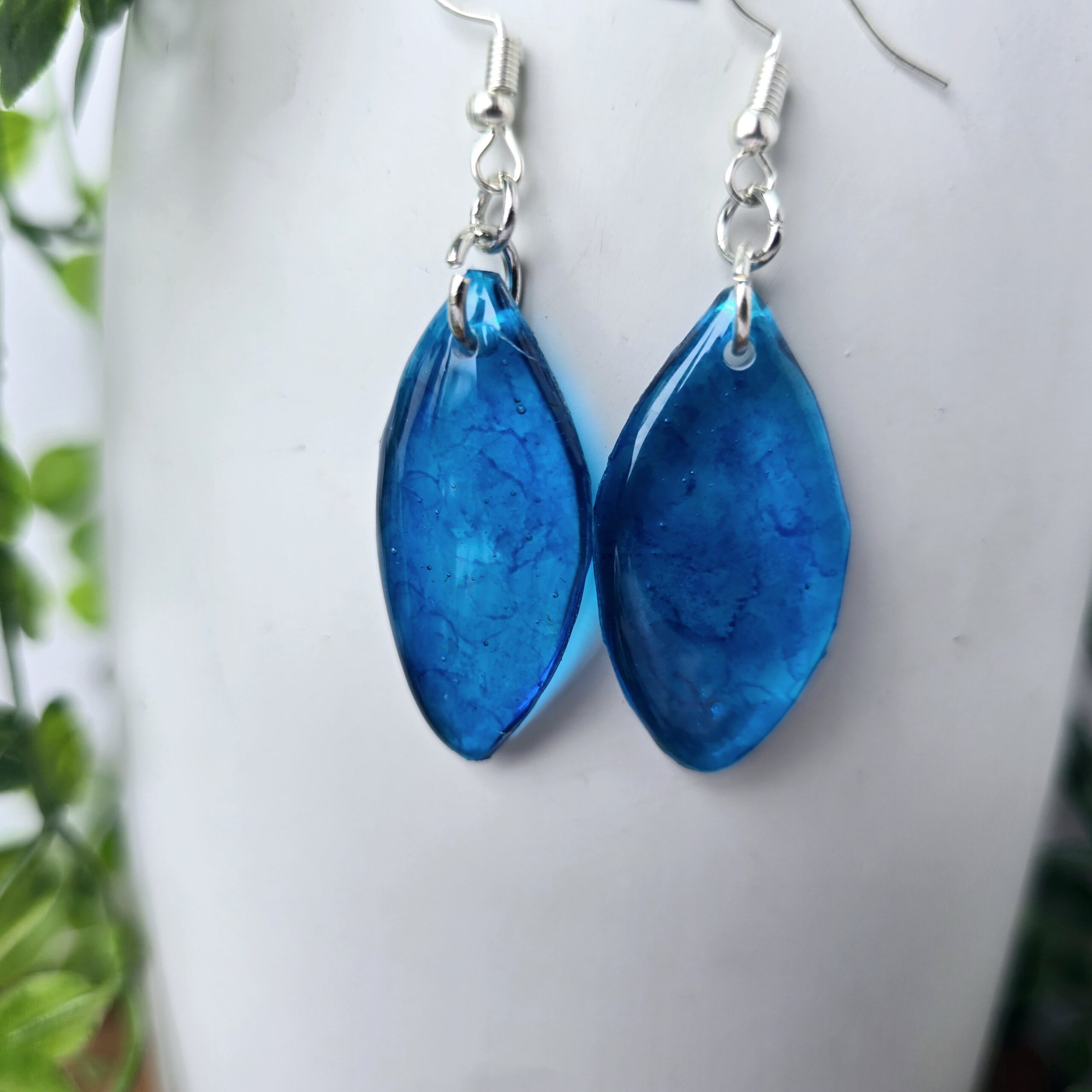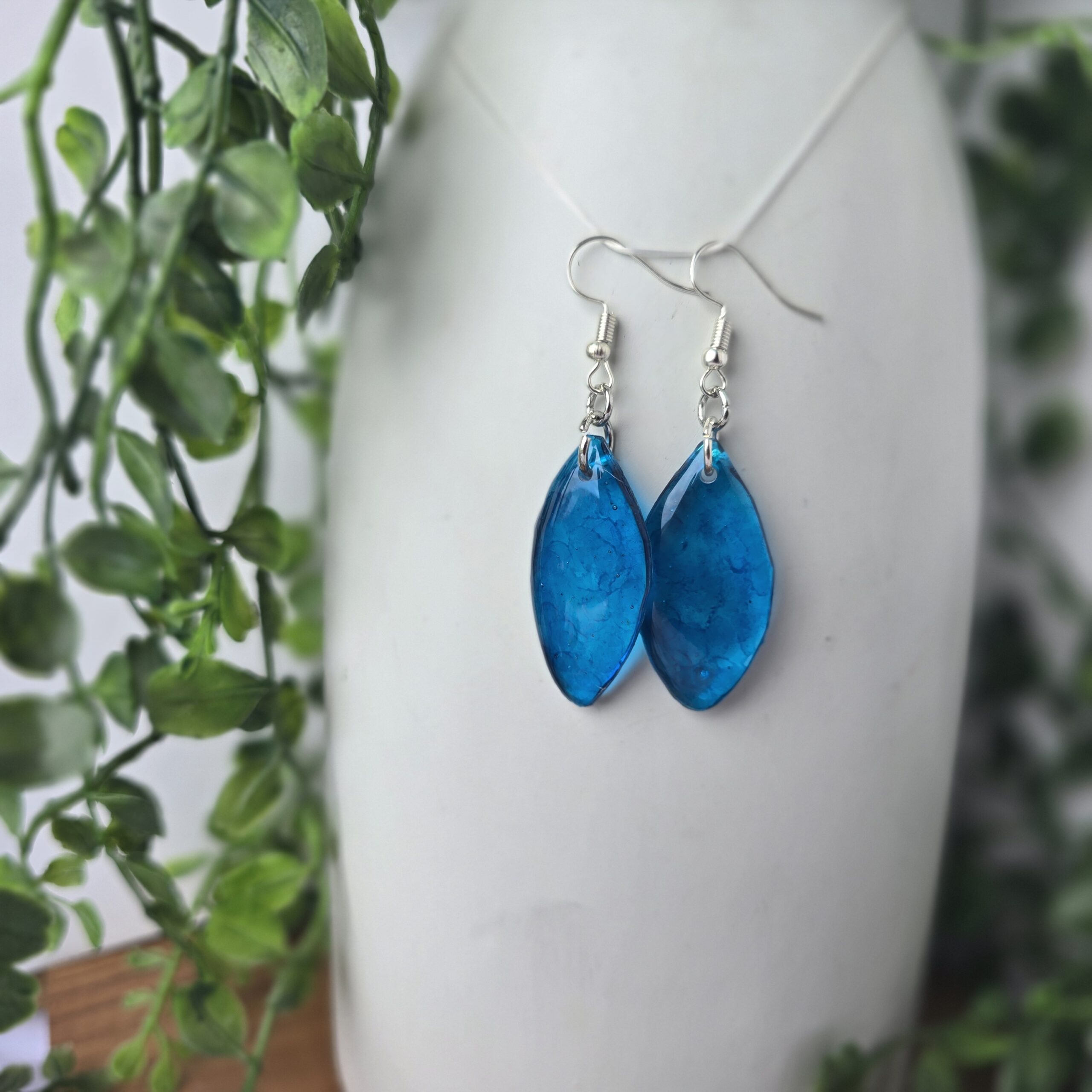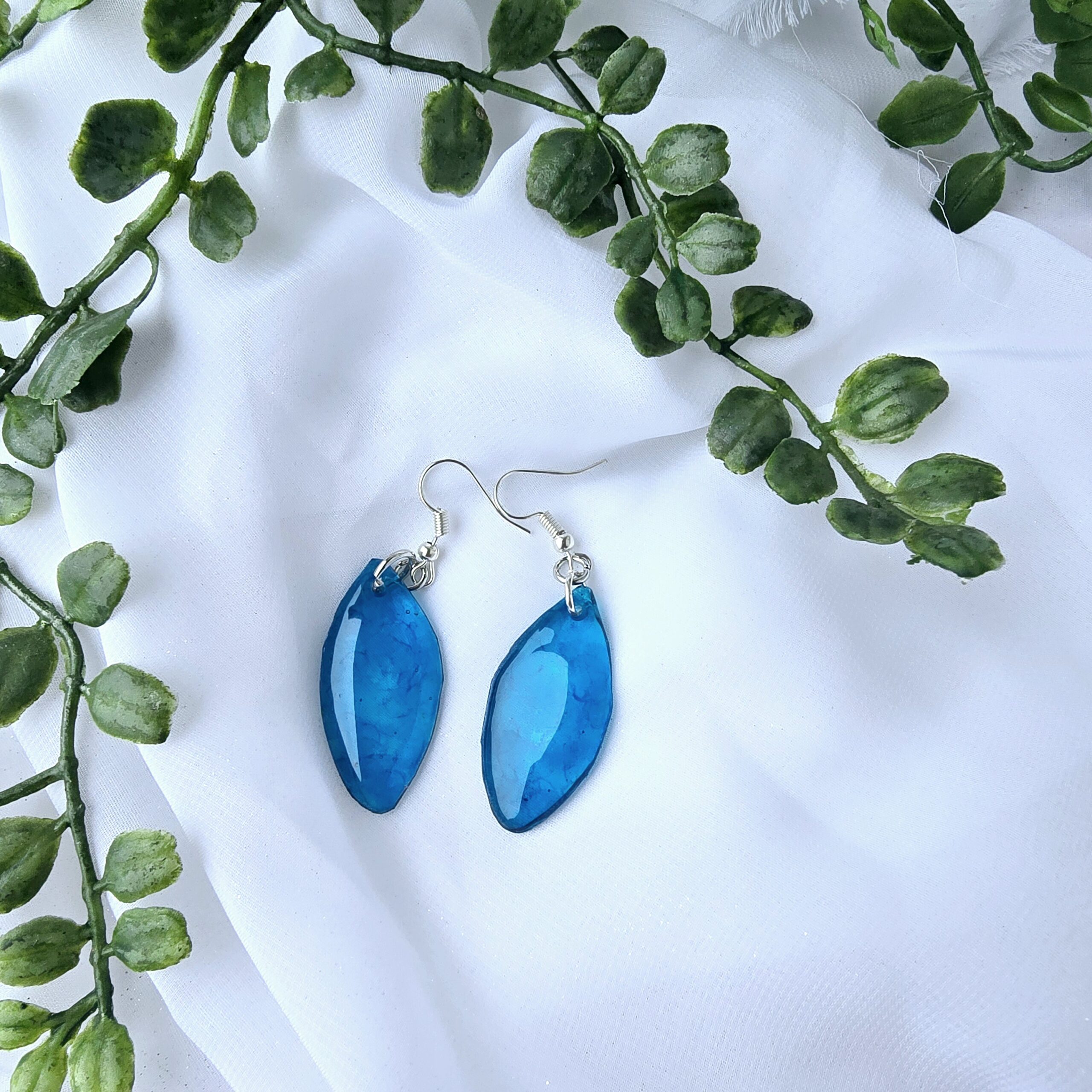 This pair reflects beauty of nature, offering a refreshing and organic feel. They are shades of blue and are transparent. These earring have been inspired by water and nature making then perfect for anyone who appreciates eco friendly fashion. Whether dressing up for an event or adding a statement piece to your everyday look, these one of a kind pair are not only light, but comfortable to wear.
