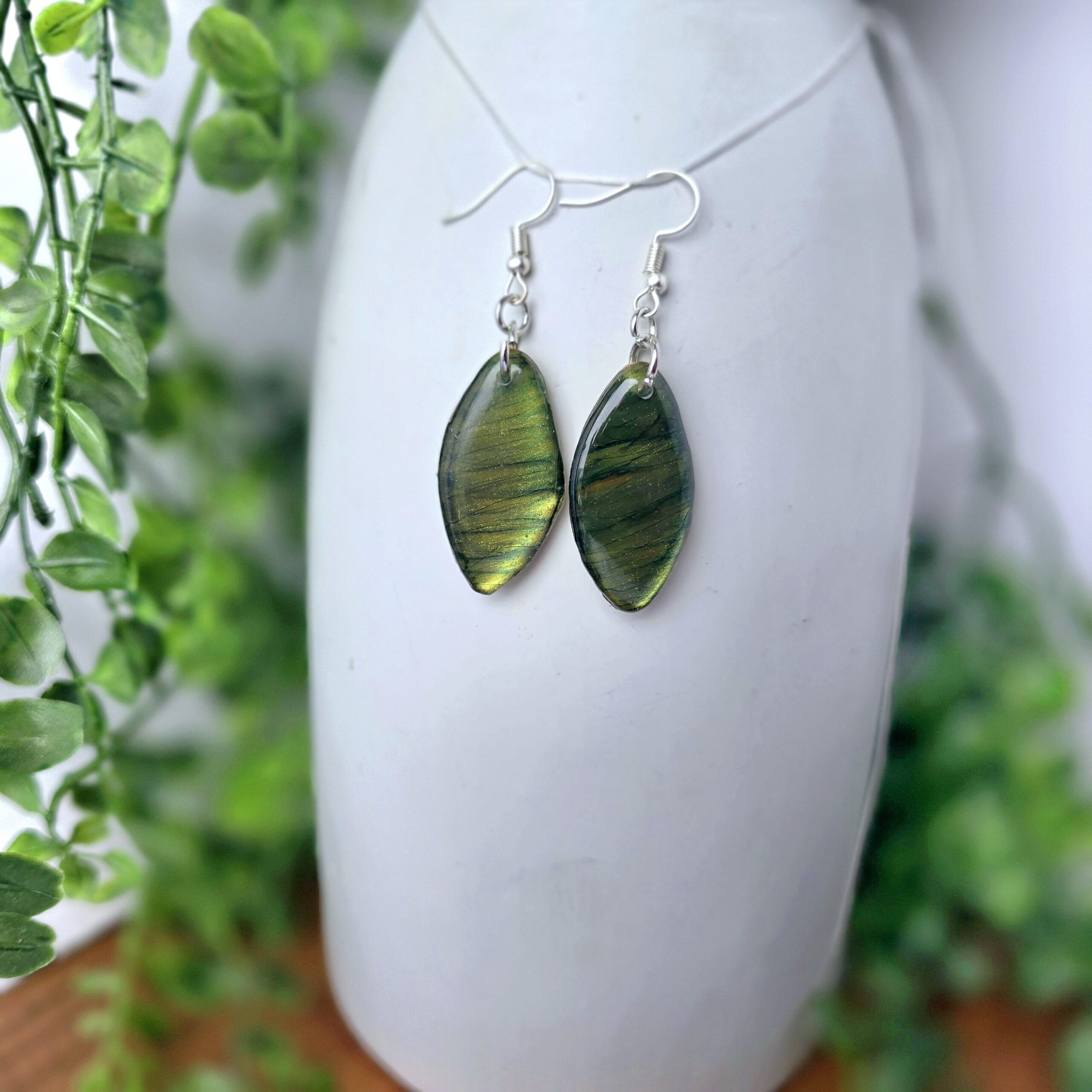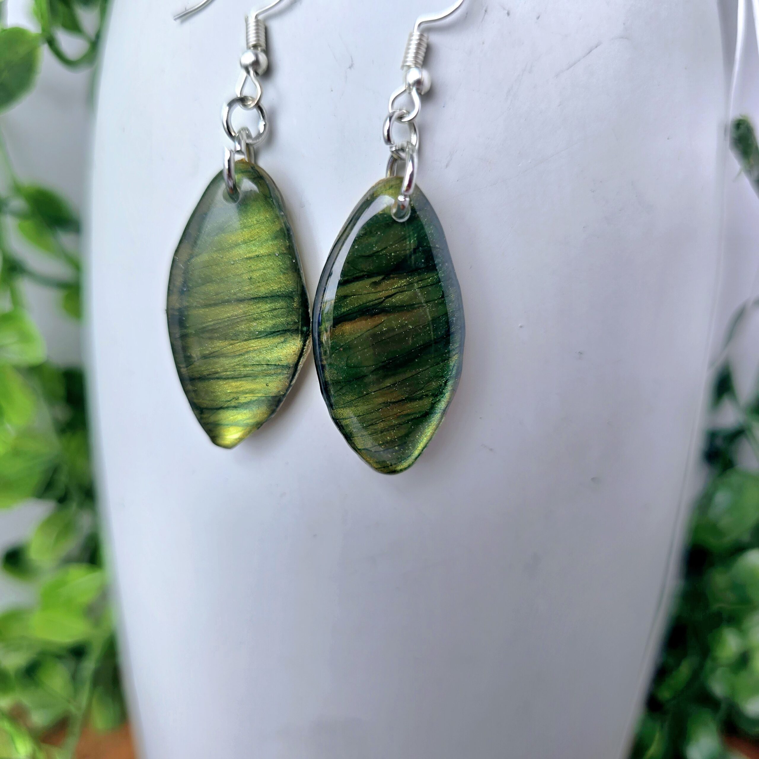 They are olive with shades of gold and reflect the beauty of nature, offering a refreshing and organic feel. Each piece has been inspired by nature making then perfect for anyone who appreciates eco friendly fashion. Whether dressing up for an event or adding a statement piece to your everyday look, these one of a kind pair are not only light, but comfortable to wear.