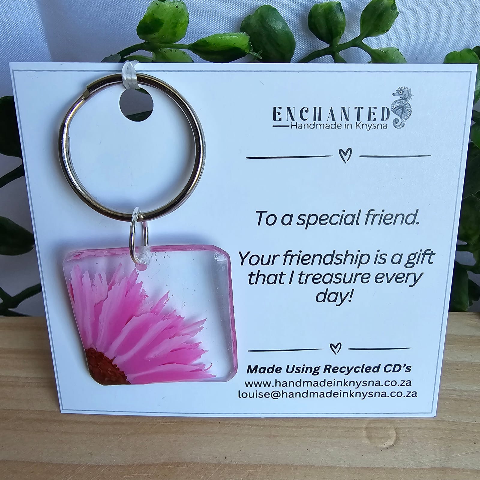 A card with a keyring attached. The keyring is made out of an old CD and has a flower hand painted on in layers to give it a 3D effect.