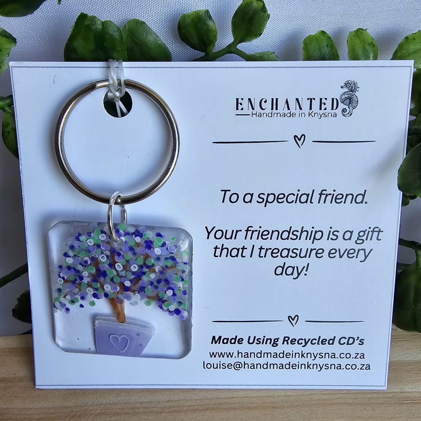 A card with a keyring attached.  The keyring is made out of an old CD and has a tree of life hand painted on in layers to give it a 3D effect.