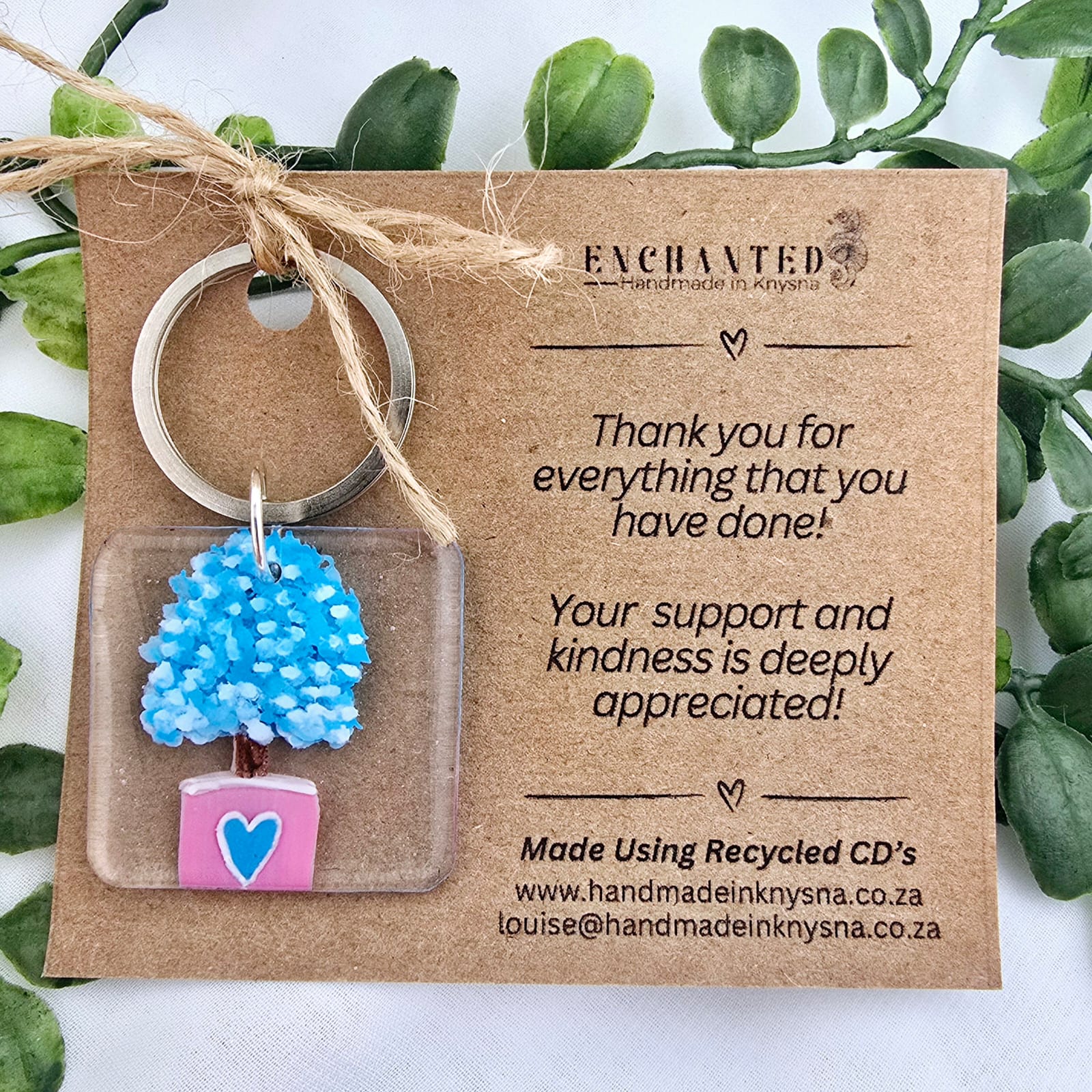 This keyring has been made using an old CD. It has been hand cut and then handpainted in layers to create a 3D effect.    This keyring comes attached to a card with a special saying, making it the perfect gift.  The tree represents a small tree of life.