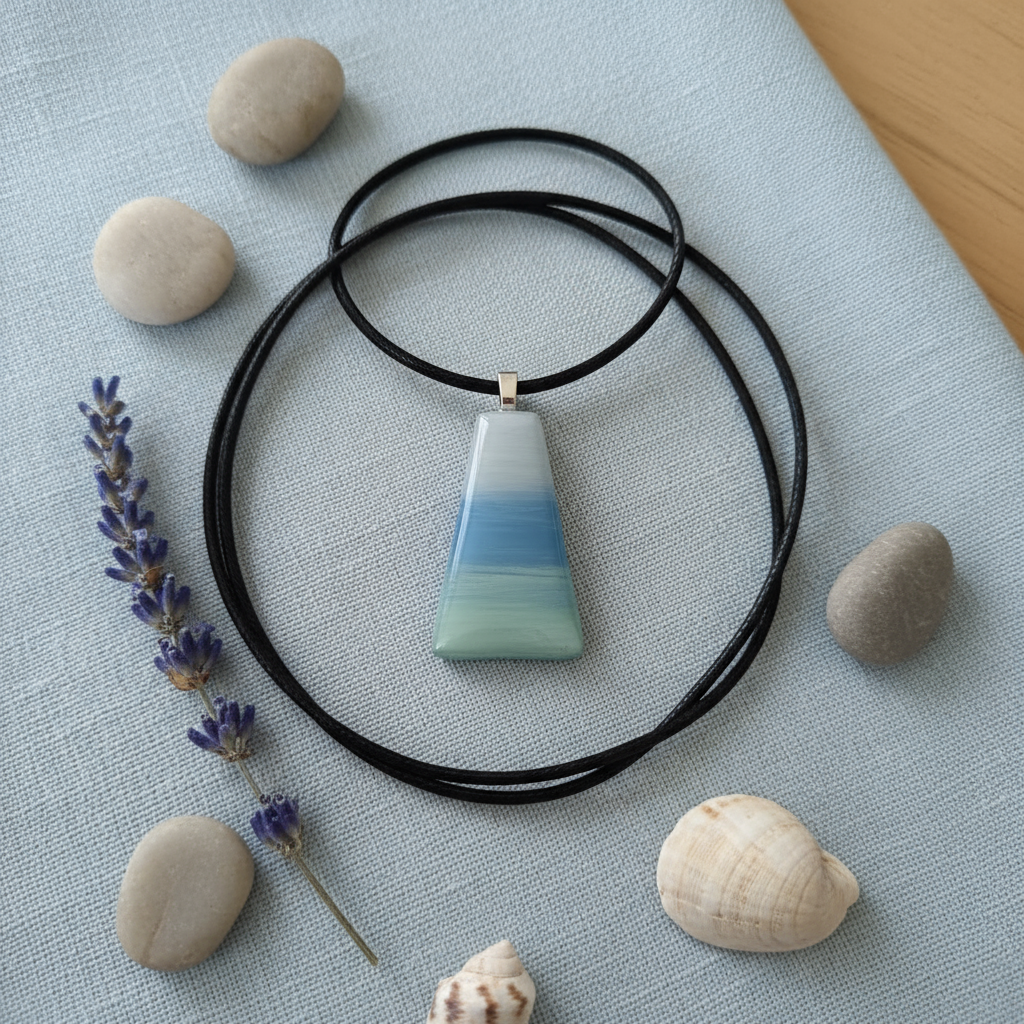 This soothing pendant is handmade from recycled CDs and shaped by hand into a soft, modern design. Each piece is painted in layers of gentle blue, duck-egg, and taupe tones, then sealed with a special environmentally safe resin that adds a smooth, glossy finish. Light reflects softly across its surface, giving it a peaceful shimmer that feels both natural and elegant.