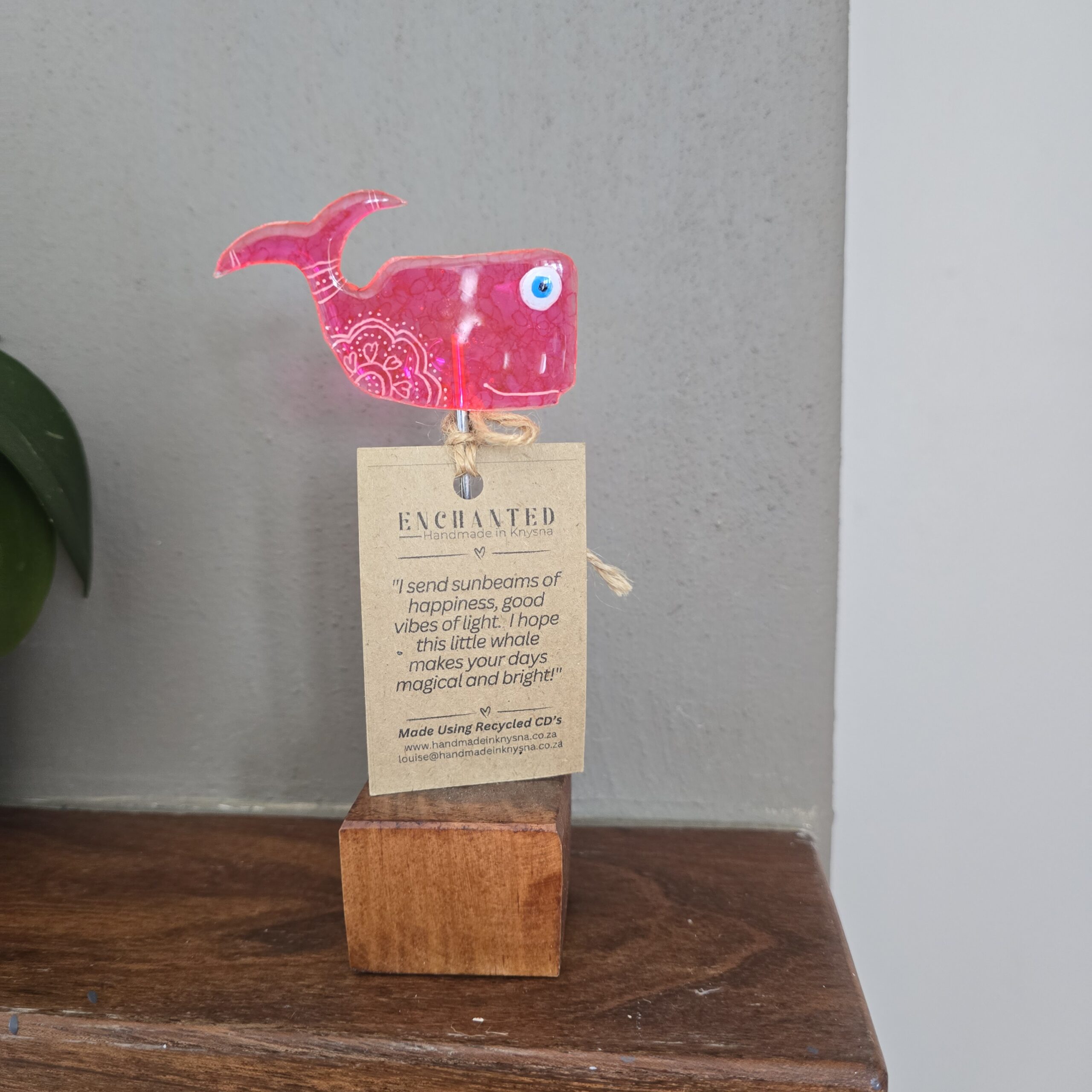Finished in pink with soft white detail, it’s mounted on a wooden stand and easy to display on a shelf, desk, or windowsill. Each whale includes a small message card with an uplifting saying.