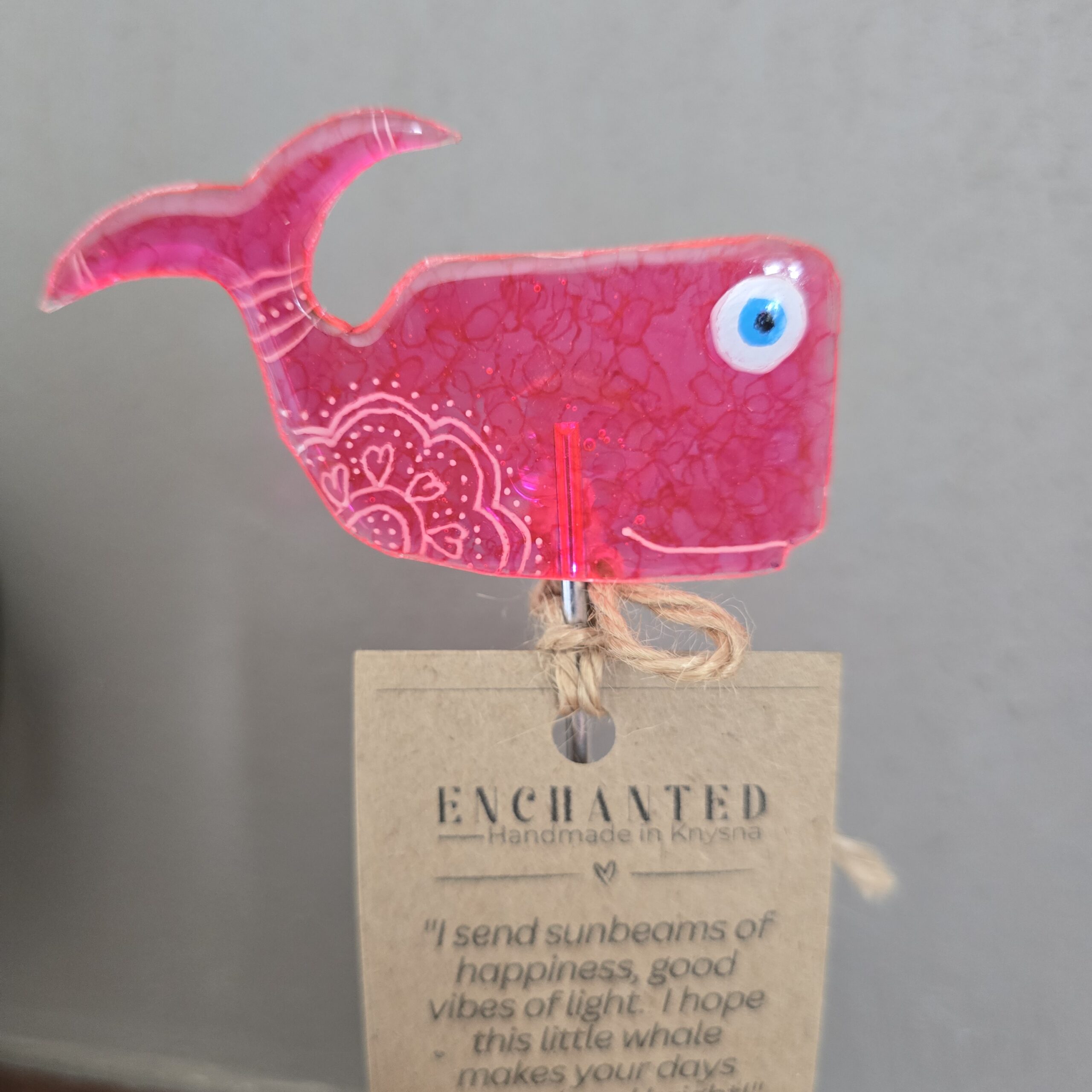 Every whale includes the same uplifting message, tied neatly to the stand.  The message is: ” I send sunbeams of happiness, good vibes of light.  I hope this little whale makes your days magical and bright!”
