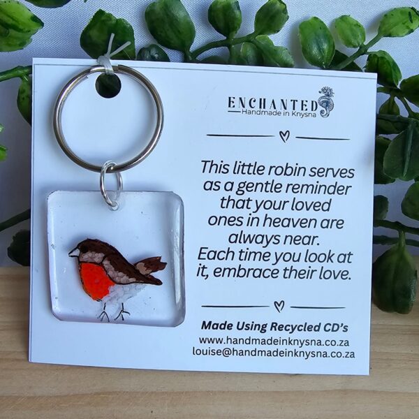 A beautiful card with a keyring attached.  There is a little robin hand painted on it. Made using an old CD and painted in layers to create a 3D effect.