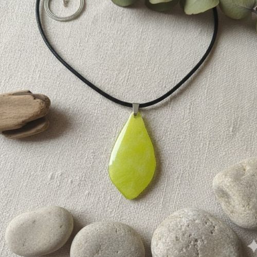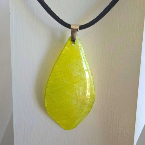 This eye-catching pendant is handmade from a recycled CD, shaped into a smooth, organic form that reflects light softly. It’s been delicately painted in layers of pearl and lime green, creating a gentle shimmer that looks like fine, flowing strands. Each piece is sealed with an environmentally safe resin for a glossy, lasting finish that’s both lightweight and durable.
