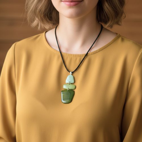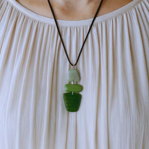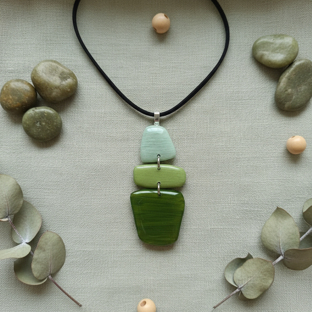 This unique pendant is handmade from recycled CDs, shaped and layered in soothing shades of mint, olive, and deep forest green. Each tier is individually hand-cut and painted, then sealed with an environmentally safe UV resin for a smooth, glossy finish that catches the light softly.