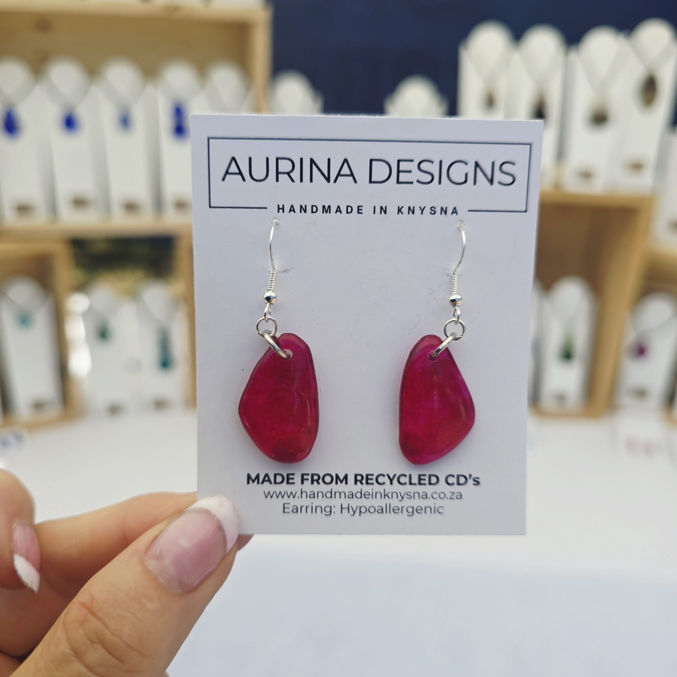 Each pair of earrings is handcrafted from recycled CDs and finished by hand in Knysna, South Africa.